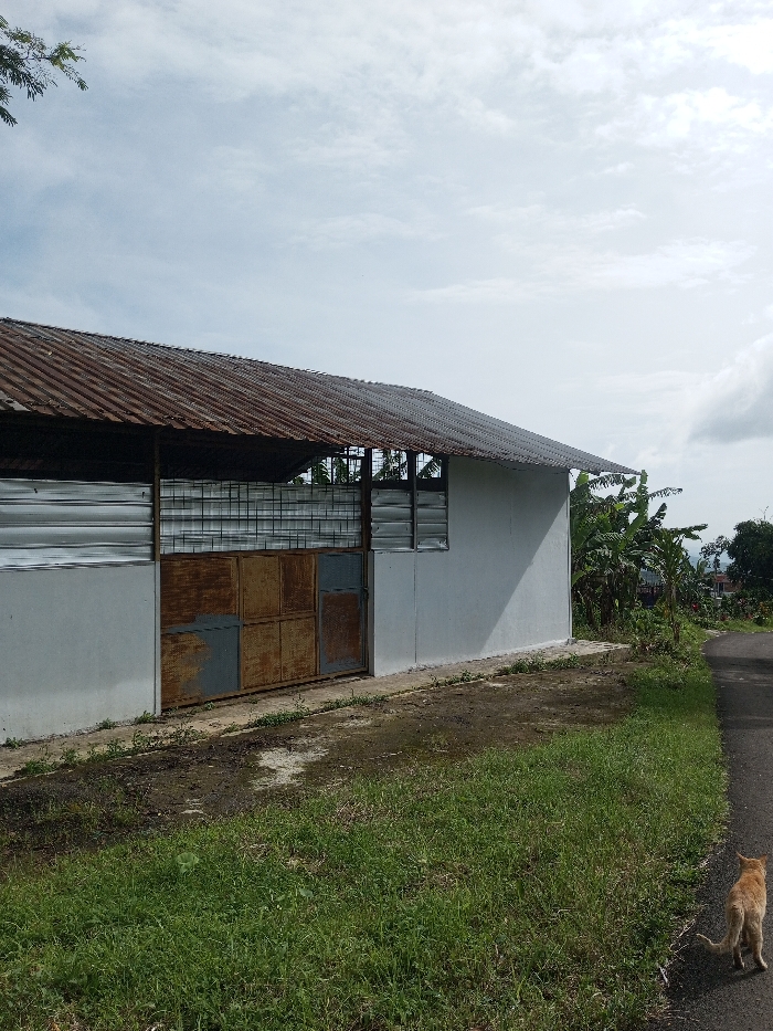 A weathered building with a corrugated metal roof and faded white walls stands adjacent to a narrow asphalt road. A rusty metal gate and barred windows define the structure's facade. Lush green grass covers the foreground, while a light orange cat walks on the road. Overcast skies and distant foliage complete the scene.