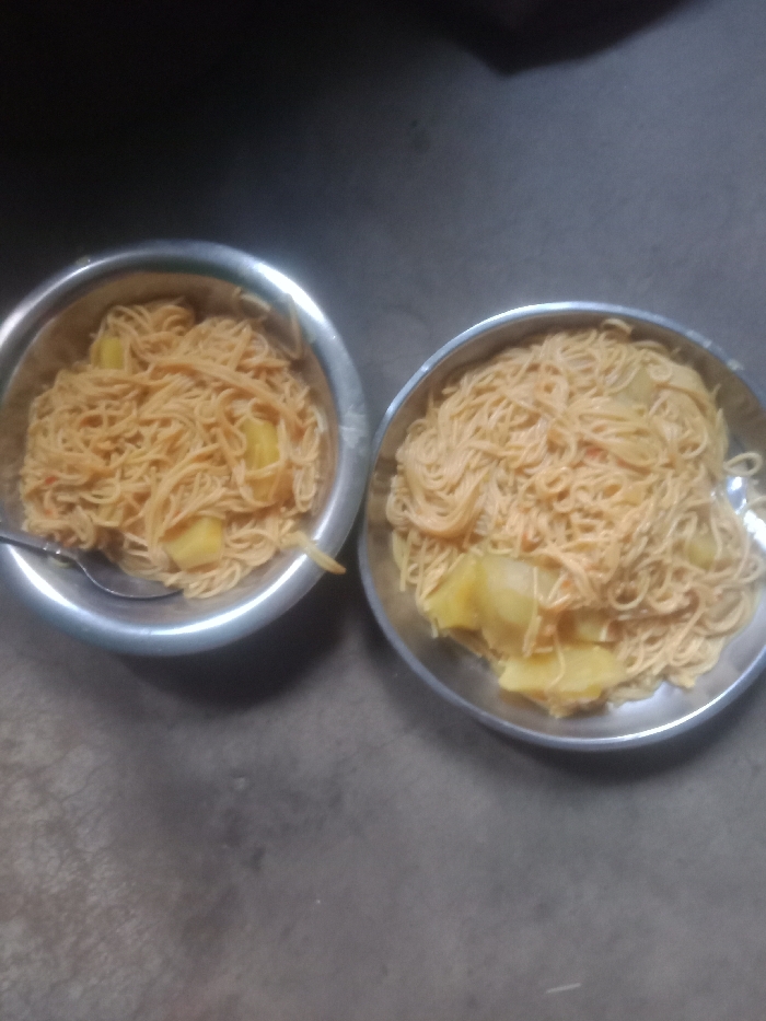 The scene, identified as Hotoro North, Nigeria, displays two separate portions of food on a dark, textured ground surface. Each portion consists primarily of thin, light orange-beige noodles, intermixed with several irregularly shaped, pale yellow pieces of cooked starchy vegetable, consistent with potatoes or plantains. The left portion is contained within a silver-colored, deep metal bowl, with a silver spoon resting inside the food. The right portion is presented on a shallower, wider silver-colored metal plate or bowl. No persons or active interactions are visible.