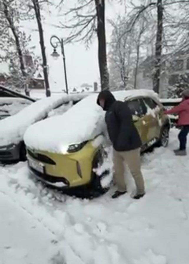 In a snowy outdoor setting, a person wearing a black jacket and khaki pants is removing snow from the hood and windshield of a yellow car parked on a snow-covered street. Another person in a pink jacket stands to the right of the frame near the back of the car. The ground is covered in snow, and bare trees line the street. The car next to the yellow one is also covered in snow. A street lamp is visible in the background.