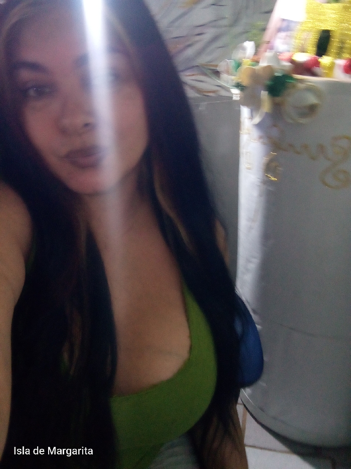 A woman poses for a selfie. She has long, dark hair with blonde highlights. She wears a green top. The lighting is bright, with a strong light source obscuring parts of her face. A decorated white object with gold embellishments is visible to the right of the frame. Text reading "Isla de Margarita" is in the bottom left corner.
