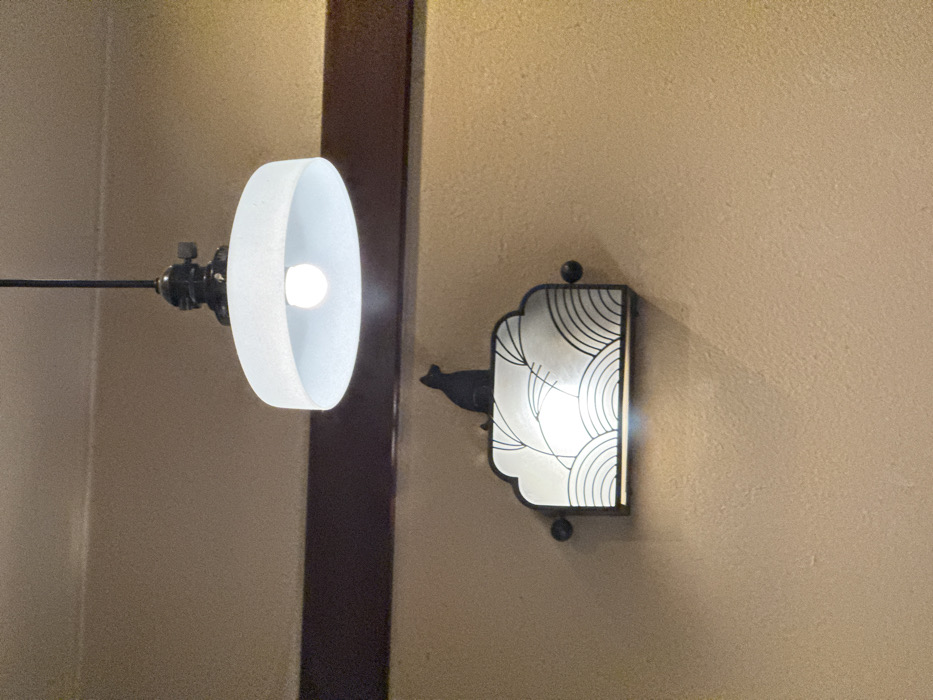 The image depicts an interior scene, likely a commercial establishment, within Shibuya, Japan. A pendant light fixture with a black suspension rod and a white, frosted, bowl-shaped shade containing an illuminated spherical bulb hangs from the ceiling in the upper center. Below and slightly to the left of the pendant light, a rectangular wall-mounted decorative element is visible. This element features a dark frame with an ornate, arched top edge and two spherical finials protruding horizontally from the sides. Its central panel is illuminated from within, displaying a pattern of thin, curved lines resembling grass or concentric arcs. Perched atop this wall fixture is a dark, silhouetted figurine of a cat, positioned in a seated posture and facing towards the right. The walls are a textured light beige, and a horizontal dark brown trim or beam runs across the upper section of the wall, separating it from the lighter-toned ceiling. No individuals are present in the frame.