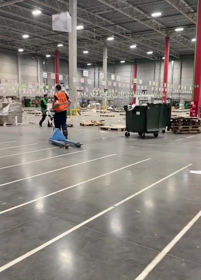 interior of a large warehouse. The concrete floor is marked with white lines forming lanes. Overhead are numerous bright lights and a visible ceiling structure. Several red and green support columns are spaced throughout. In the distance, various objects are scattered around the floor, including pallets and wrapped items. There are also signs hanging from the ceiling. Two workers are visible in the video. One worker wearing an orange vest is moving across the floor on a small blue scooter-like device. The other worker, wearing a green vest, is carrying a large, white, shapeless object. A green dumpster on wheels is stationary in the foreground.