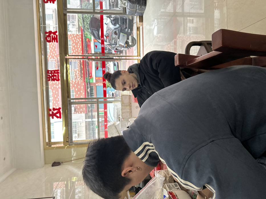 Inside a storefront with visible Chinese script on the glass, a woman with her hair in a bun wears a dark jacket and looks towards another person, who is partially obscured, wearing a blue sweatshirt with white stripes on the sleeve