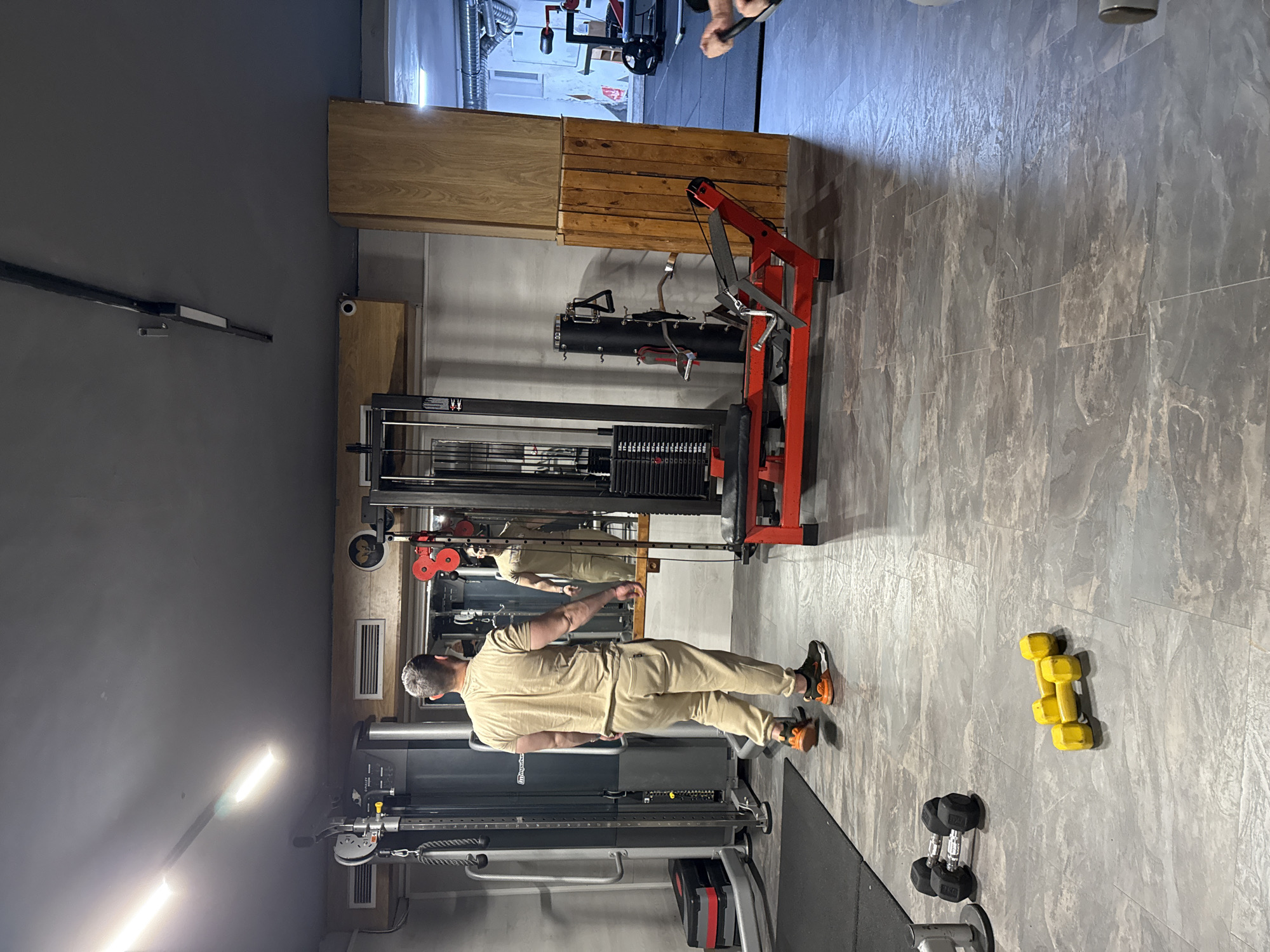 The image depicts an indoor fitness facility located in Vratsa, Bulgaria. A male individual stands facing a large rectangular mirror, positioned centrally in the frame, viewed from the back. He has short, graying hair and is attired in a tan short-sleeved t-shirt, matching tan sweatpants, and black athletic shoes with orange accents. His reflection, showing him facing forward, is visible in the mirror. The facility features a dark gray ceiling with multiple linear LED light fixtures, one of which emits a significant glare in the upper left. The floor is covered with gray, marble-patterned tiles. Light gray walls are visible, with a section of wooden paneling on the left, beneath which are air conditioning vents. A security camera is mounted on a wooden beam above the mirror. Various gym equipment is present. On the left, a gray and black multi-gym cable machine with a weight stack is visible, alongside a black and red step platform. Two black hexagonal dumbbells rest on a black mat on the floor near the cable machine. In the center, a red and black lower body exercise machine, possibly a rowing or leg press unit, is positioned in front of the mirror. Adjacent to it is a black stand with multiple workout handles attached. Two yellow dumbbells lie on the floor in the foreground. To the right, an open doorway reveals a further section of the gym, including additional equipment and exposed silver ductwork.