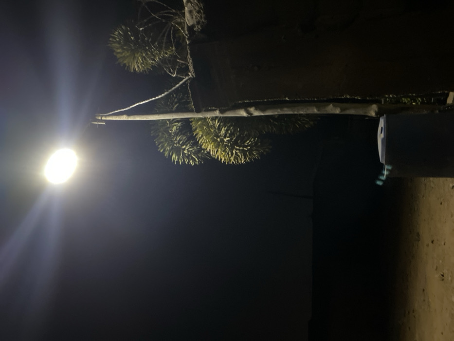 A bright street lamp illuminates the dark night. Above, thorny plants hang down from a ledge. To the right, a dark building rises, while a patch of brown ground is visible. The image is dark and grainy.