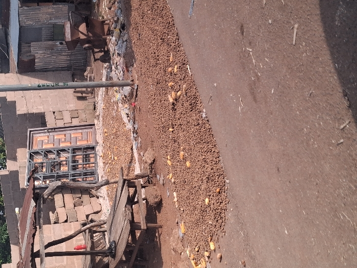 The image displays an outdoor scene in Wukari, Nigeria. The foreground and midground feature a reddish-brown dirt and gravel surface, on which a large quantity of small, reddish-brown, spherical produce, likely groundnuts, is spread out for drying. Numerous yellow corn cobs are scattered throughout this drying produce. To the left, a rustic, open-sided wooden stall with a corrugated metal roof is visible. Two wooden benches or tables are positioned underneath this structure, with a red plastic bottle resting on one. A gnarled, weathered wooden post supports the stall's roof. In the background, unplastered concrete block walls are present. Leaning against these walls are several metal doors and window frames, some featuring decorative paneling. A vertical metal utility pole stands centrally in the midground, with a small accumulation of mixed refuse at its base, including plastic bags. To the right, a structure constructed from corrugated metal sheeting is visible, adjacent to an industrial-type agricultural machine, possibly a grinding mill or sheller, which features a hopper and wheels. No human subjects are present in the scene.