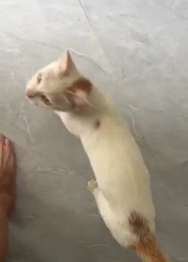 The video begins with an overhead shot of a cream-colored cat with brown spots on its head and tail, standing on a gray tile floor and meowing at a person's feet. The cat sticks its tongue out and looks up at the person. The person is barefoot. A yellow bag of "me-o" cat treats is shown. The video ends with a view of the cat, from above, standing on the tile floor and looking upward, with the person's feet in view.