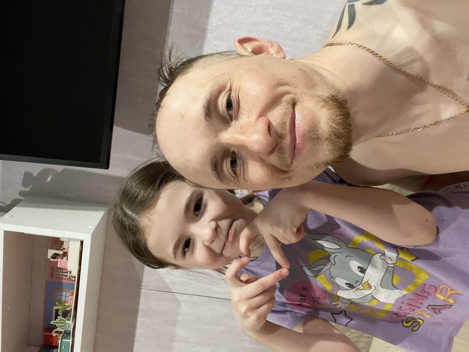 An indoor scene in Sarapul, Russia, depicts an adult male and a young female child posing for a photograph