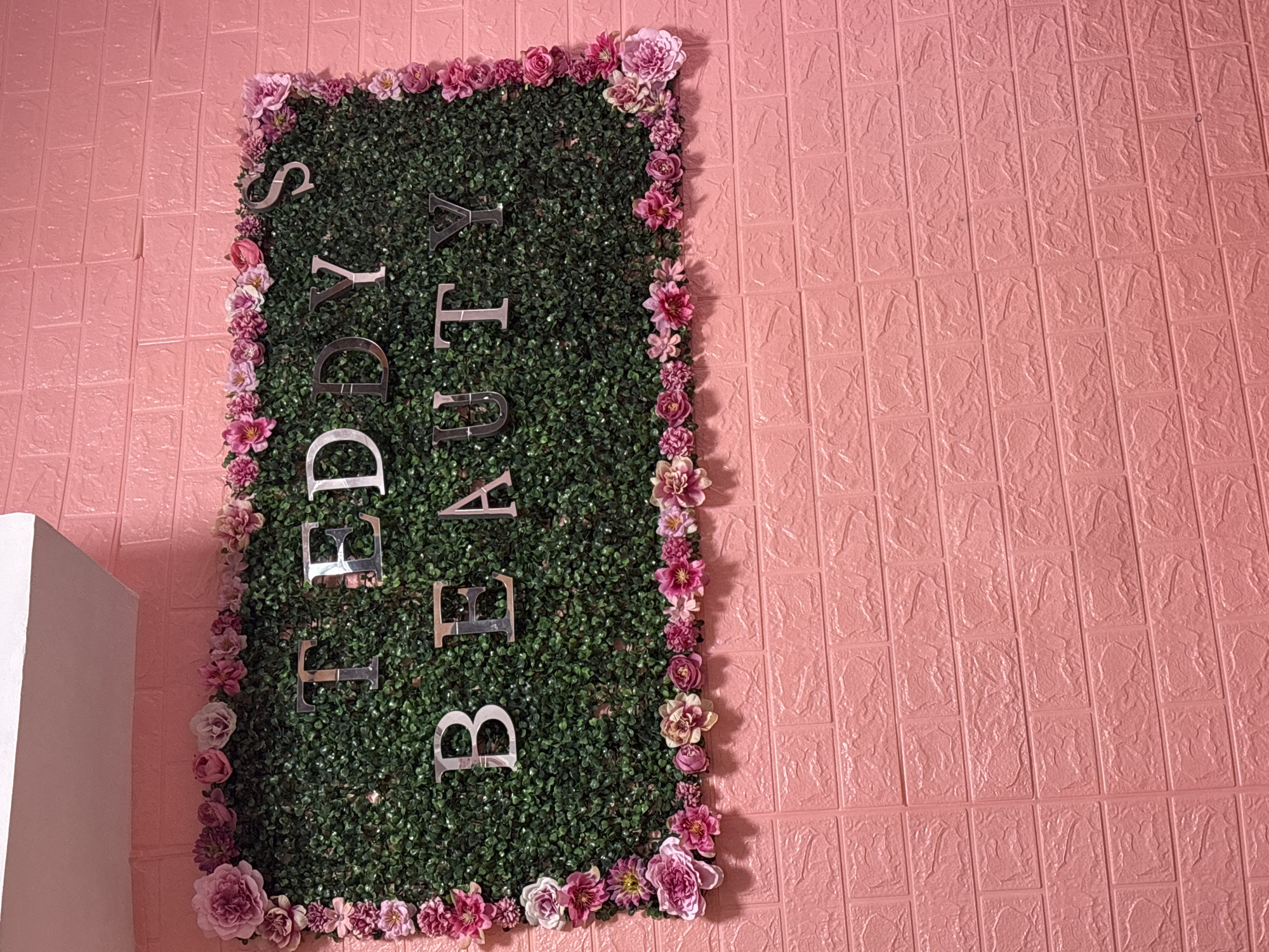 A vertically oriented rectangular sign is displayed on a pink, brick-patterned wall. The sign has a green leafy background, decorated with a border of pink and white flowers. Silver lettering is attached to the greenery spelling out "LEDA'S BEAUTY." The sign is located indoors. The city of Tvarditsa, Bulgaria is not discernable.