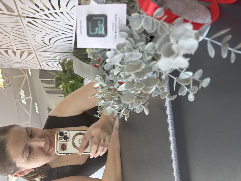 A woman is depicted taking a mirror selfie inside "THE BEAUTY ROOM" located at Mira Street, 43, 2nd floor, office 2, in Chaikovsky, Russia. The woman, shown from the chest up in reflection, has brown hair and wears a black top, a gold-colored necklace, and a gold-colored hoop earring. A gold-colored wedding band is visible on her left ring finger. She holds an iPhone in a light-colored case featuring red lips, a magnetic ring, and a heart graphic. The phone's screen is angled towards her, indicating a selfie action. In the foreground, resting on a dark, reflective surface, is a cluster of artificial eucalyptus leaves, partially obscuring a white "STICKER PACK" that clearly displays "THE BEAUTY ROOM" branding and the establishment's address. A red ribbon is also visible next to the eucalyptus. The background, reflected in the mirror, shows a brightly lit interior with a white ceiling, overhead lighting fixtures, green potted plants, and white decorative wall panels with intricate cut-out designs.