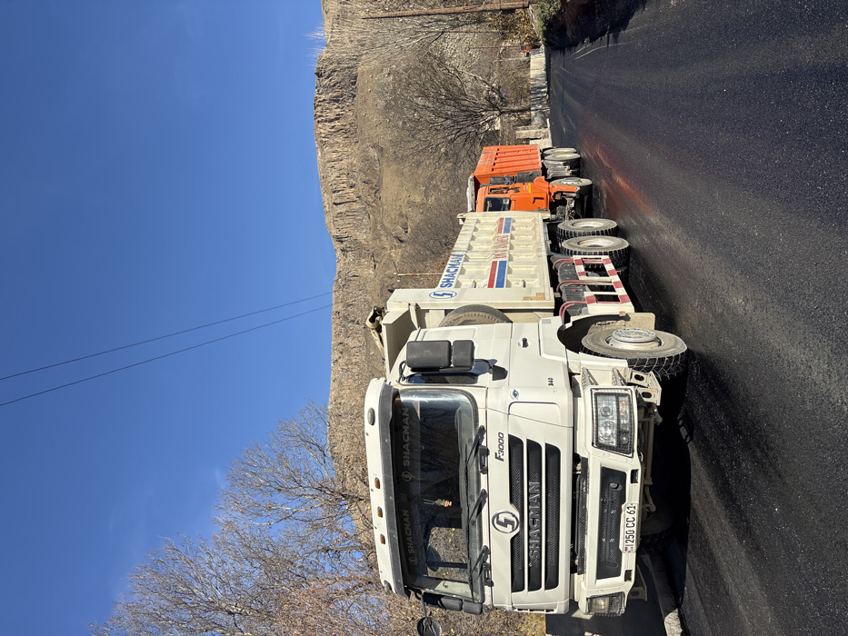 The image depicts a clear, sunny day in Vaghatin, Armenia. In the foreground, a white Shacman F3000 dump truck, model 340, with Armenian license plate 250 CC 61, is stationary on a dark, recently paved asphalt road. The truck is positioned on the left side of the frame, facing slightly forward and to the right. Its cab and grille display "SHACMAN" branding. Behind it, partially obscured, is a second, orange dump truck. The asphalt road, appearing wet or freshly laid, curves gently to the right in the midground. To the left and right of the road, bare deciduous trees are visible, indicating late autumn or winter. The background features a large, rugged mountain range characterized by prominent rocky formations, possibly columnar basalt, under a cloudless blue sky. Two thin power lines traverse the upper portion of the frame. No individuals are present in the scene.