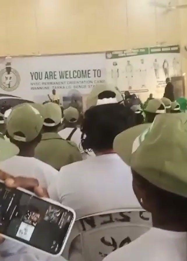 A large group of people wearing white shirts and green caps are seated in rows in a large indoor room. Many of them are facing a stage at the front of the room. A banner reading "YOU ARE WELCOME TO NYSC PERMANENT ORIENTATION CAMP, WANNUNE, TARKA L.G BENUE STATE" is visible on the stage. Someone in the front row is holding a smartphone and recording the scene, with the phone's screen showing a video of a person performing. Music can be heard in the background. The room has a high ceiling with ceiling fans. The scene appears to be some kind of orientation or welcome event.