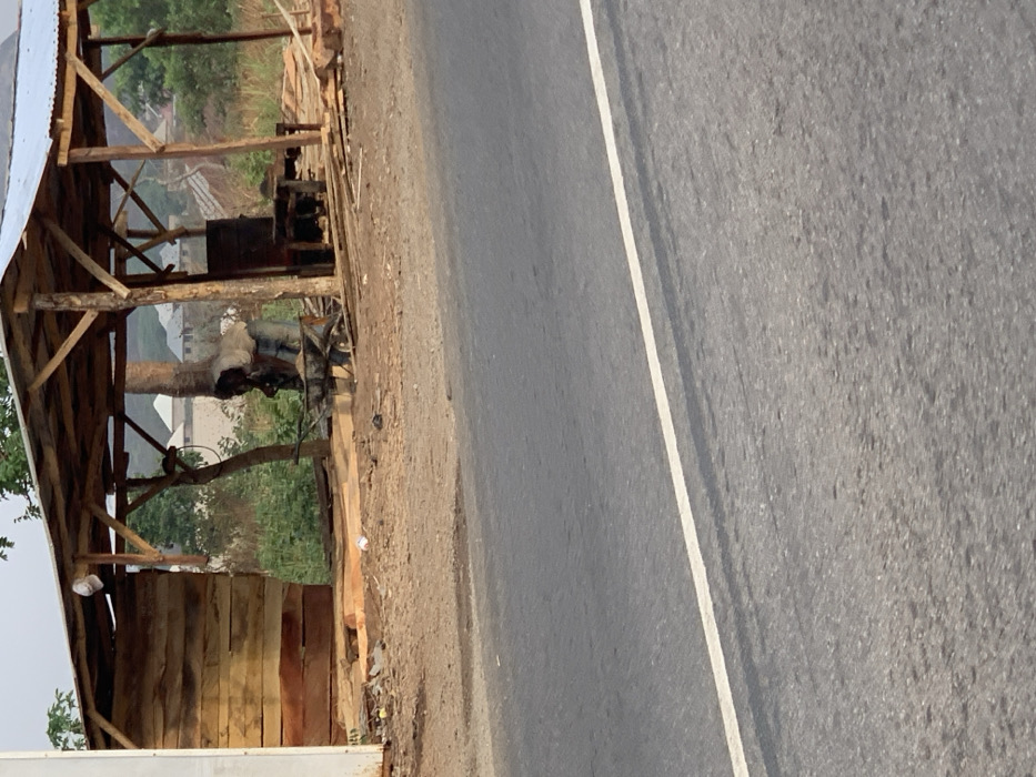 A roadside construction site features a wooden shelter with a corrugated metal roof. Inside the shelter, dark objects are present, appearing partially obscured by a tree. A grey asphalt road runs alongside the site, marked with a solid white line dividing the lanes. The road surface shows signs of wear. The surrounding area includes dirt and sparse vegetation, with hints of buildings in the background.