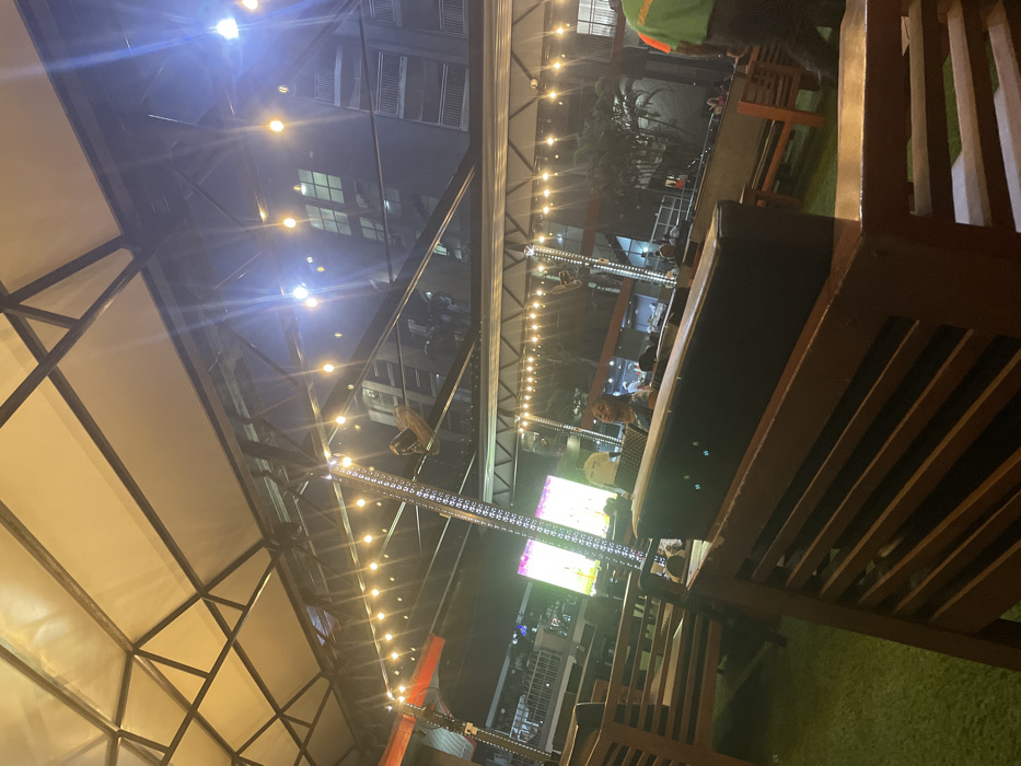 An outdoor dining area is illuminated by string lights. Tables and benches fill the space, with a television screen visible in the background. Buildings are seen beyond the dining area. A covered ceiling with geometric support beams frames the scene. People are present, contributing to the lively atmosphere.