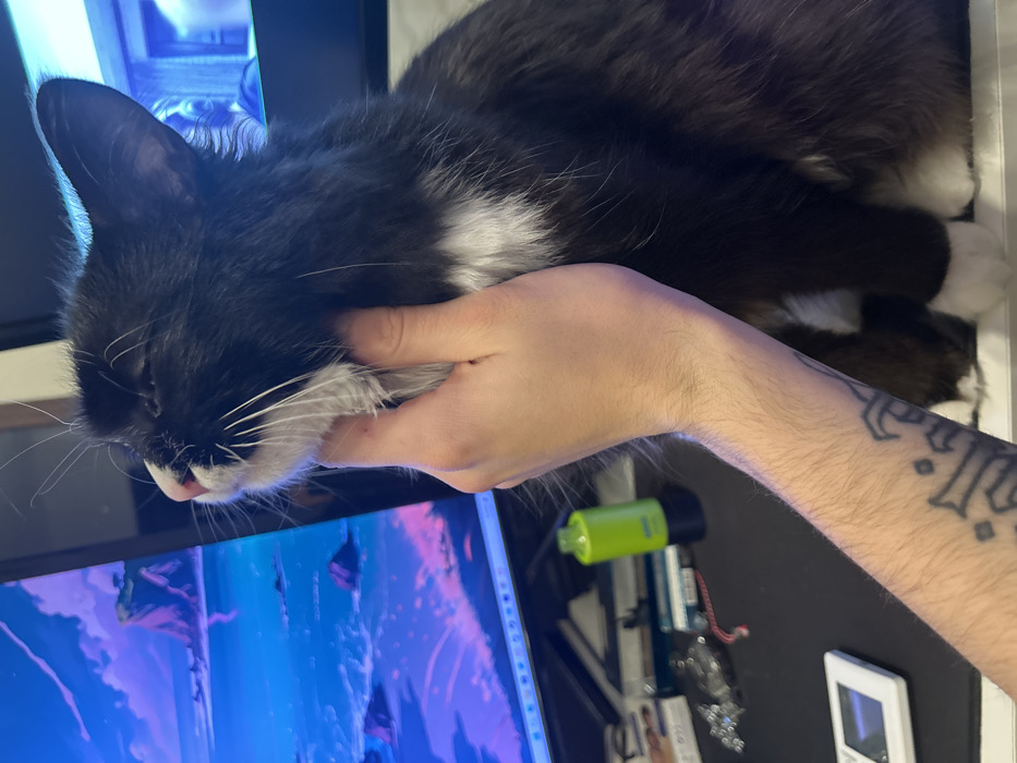 - "An indoor scene in Sofia, Bulgaria, features a human hand interacting with a domestic cat near a computer workstation" by FM-3KgxS2, licensed under CC BY 4.0