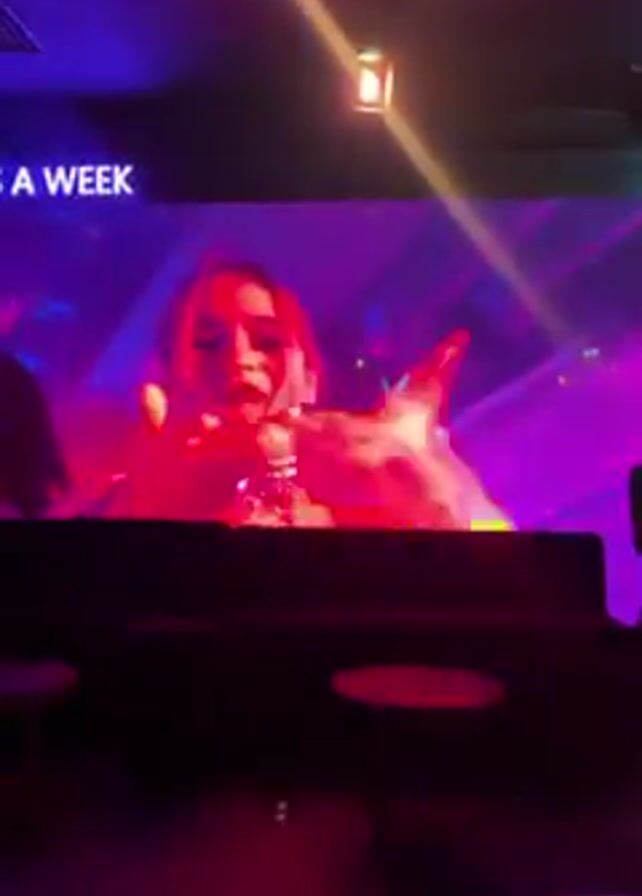 The video begins in a dimly lit nightclub-like setting, focusing on a large screen displaying video footage of people partying