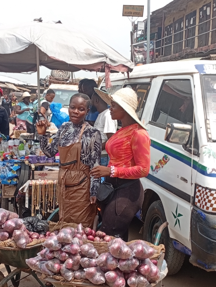 This image captures a bustling outdoor market scene in Onitsha, Nigeria, specifically near the "Akaraka Maza Assorted Articles" section, as indicated by a prominent overhead sign. In the foreground, two women are engaged in an interaction. The woman on the left, with dark braided hair and wearing a patterned long-sleeved top over a brown overall-style garment, is speaking and gesturing with her raised left hand. To her right, a second woman, wearing a wide-brimmed straw hat, an orange and red tie-dye long-sleeved top, dark pants, and a black sling bag, is listening attentively. Her right wrist displays multiple pink bracelets. Immediately in front of them, a large quantity of red onions, individually wrapped in clear plastic bags, is piled on a green metal wheelbarrow and a basket. Behind the speaking woman, a market stall displays various items, including multiple gold-colored necklaces and pendants hanging on a stand, and other packaged goods in plastic containers. To the right of the women, a white utility van or minibus with blue stripes and decorative decals, including a green star and a checkered pattern near the rear wheel, is parked. In the mid-ground and background, several other individuals, mostly women, are visible, some wearing straw hats, moving within the market. A large, light-colored market umbrella shades the foreground area. Further in the background, commercial structures or stalls with darkened windows/doorways and corrugated roofs line the area under an overcast sky. The ground surface appears unpaved.
