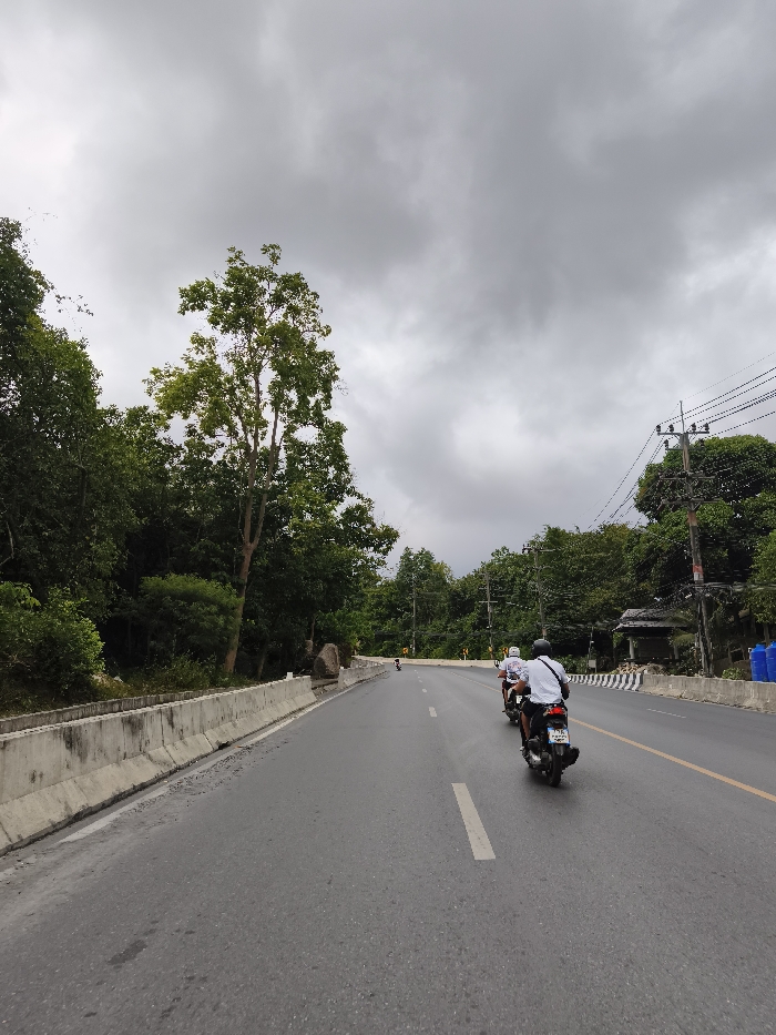 A curved road with two motorcycles traveling along it is the main focus. The road is gray and has a single yellow line on the right. The motorcycles are occupied by individuals wearing white shirts and helmets. On either side of the road, lush green trees and vegetation abound. A gray sky overhead indicates an overcast or rainy day. A gray concrete barrier lines the side of the road. Utility poles stand on the right with electric wires.