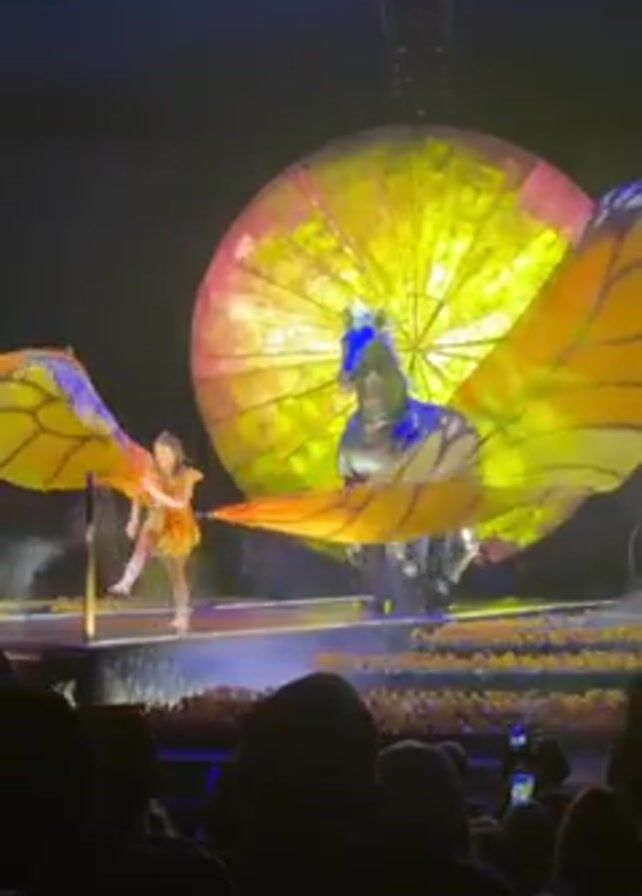 stage performance taking place in front of a live audience. The stage is decorated with yellow flowers, and the background features a large, circular, illuminated prop resembling a sun. Two performers are on stage: a woman in an orange outfit who appears to be dancing, and a person riding a horse. Both performers have large, butterfly-wing-shaped props attached to them. The rider of the horse is adorned with a blue costume element. The audience is visible in the foreground, with some people holding up their phones, presumably to record the performance.