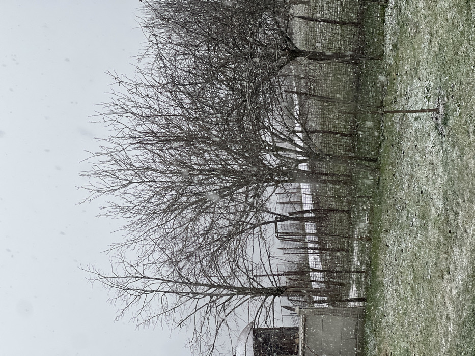 A wintry scene depicts bare trees against a backdrop of a grey sky and falling snow. A fence line runs behind the trees, separating them from a grassy field lightly dusted with snow. A small, grey, box-like structure is visible near the bottom of the frame. The overall impression is one of a cold, bleak, but quiet and still day.