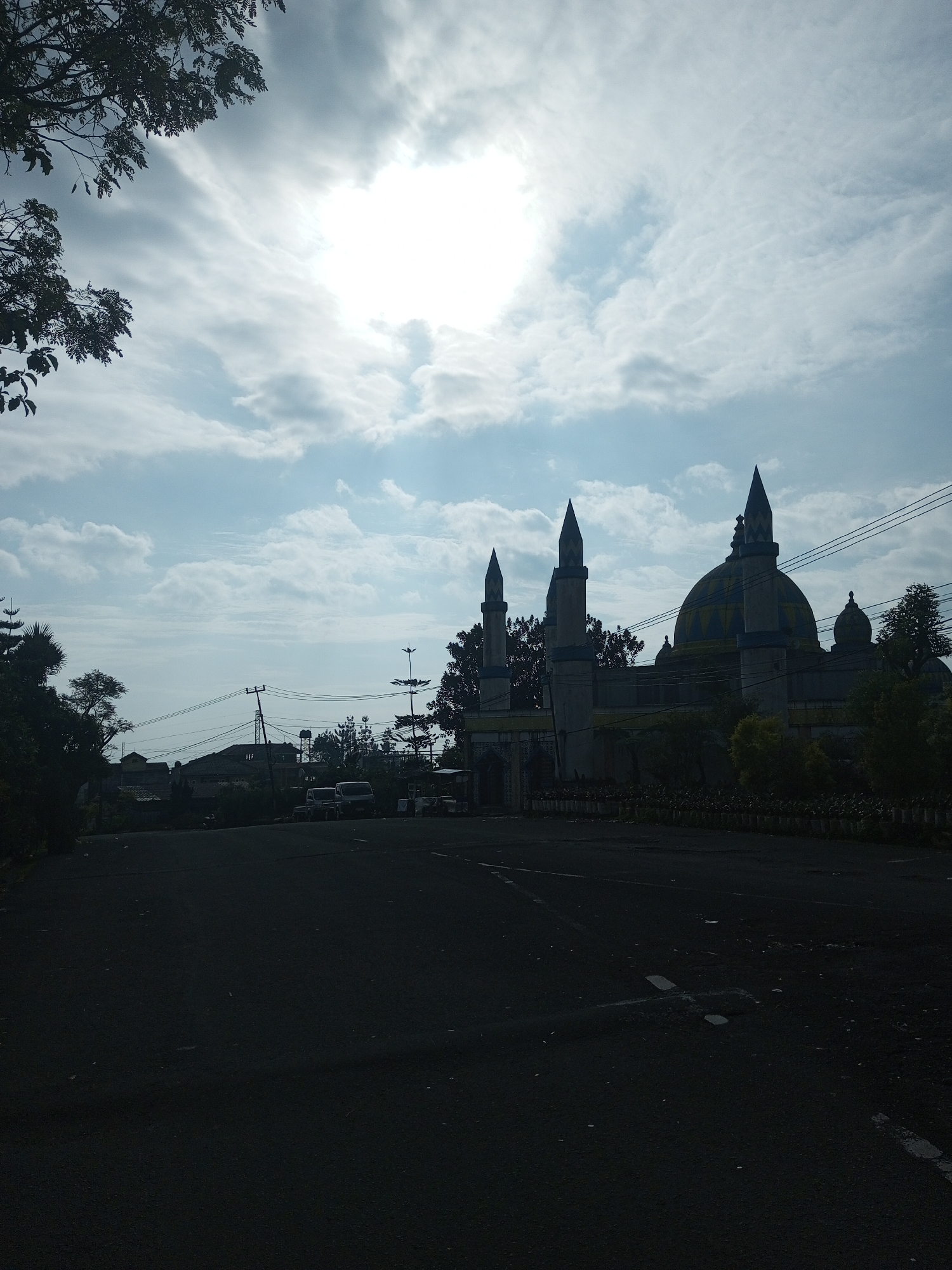 Masjid mosque in Mya Sit Kaing Ywar Thit, Myanmar. The mosque has a central dome and three minarets. It is silhouetted against a cloudy sky with a bright sun obscured by the clouds. In the foreground, there is a dark asphalt road. Across the road, there are several vehicles, a few buildings and utility poles are visible in the background. Trees and vegetation flank both sides of the road and mosque.