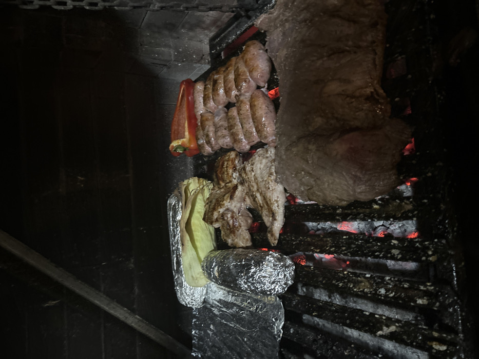 - "The image displays a close-up, elevated view of a variety of food items cooking on a charcoal grill within an enclosed, dark environment, indicative of a traditional parrilla in Villa San Andrés, Argentina" by FM-j80jY2, licensed under CC BY 4.0