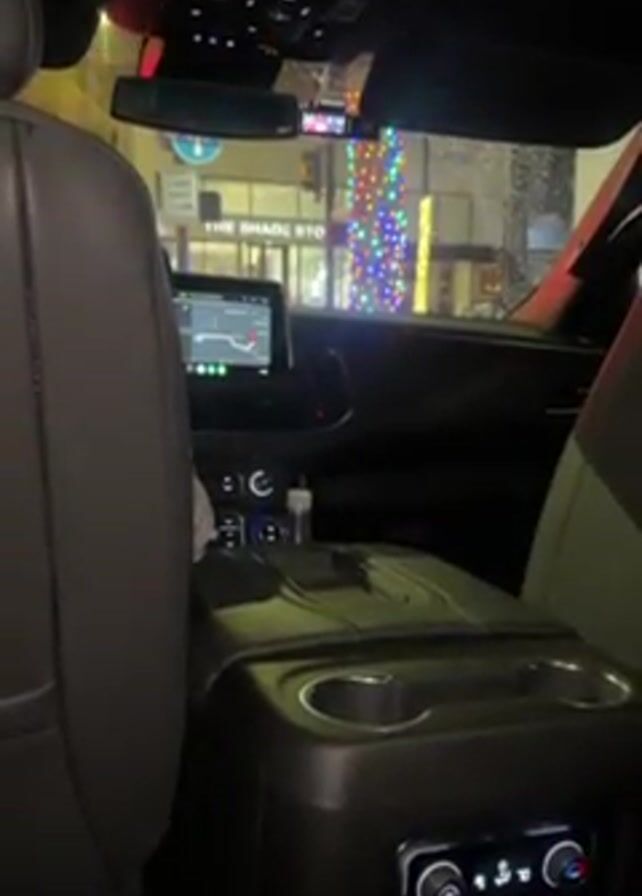 From the backseat of a car, the video shows a view of the vehicle’s dashboard and the illuminated street outside the front windshield at night