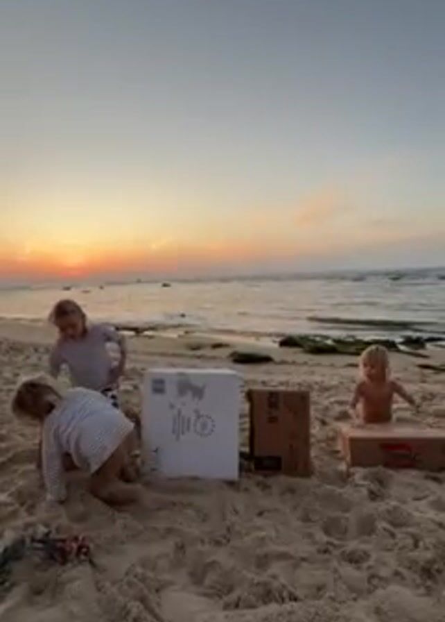 On a beach at sunset, three children are playing with cardboard boxes