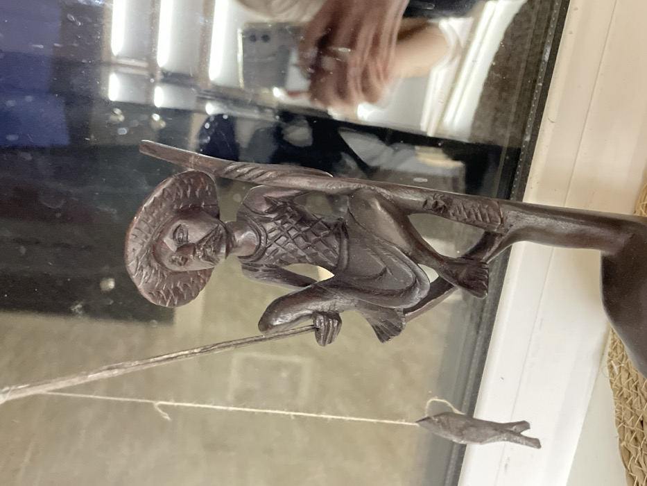 A dark brown wooden carving depicts a male figure fishing, positioned on a white windowsill atop a light-colored woven mat