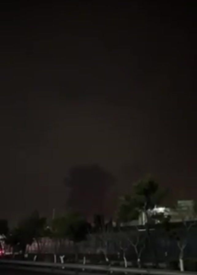 large plume of dark smoke rising in the distance at night. The smoke appears to be behind a line of trees and buildings. There is a road with a white railing in the foreground, and cars can be seen driving by. The sky is dark and there are no visible stars or moon.
