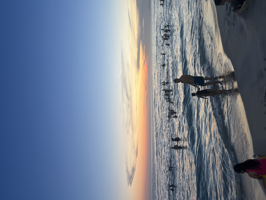 A scenic beach captures a sunset, with a mix of orange and blue hues in the sky. People are swimming in the water, some are near the shoreline. The sea is slightly wavy, and the sand has a light color. A few rocks and sand are seen on the right side of the image. Overall, the image showcases a relaxing beach scene at sunset.