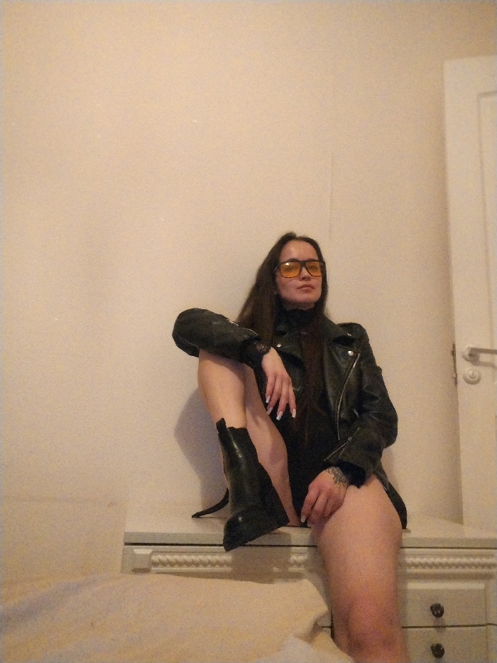 An image captured in Noviy, Russia, depicts a single female subject seated on a light-colored dresser or console table within an indoor residential setting. The subject has long, dark hair and wears yellow-tinted eyeglasses. She is dressed in a black leather jacket over a dark garment, possibly a turtleneck or bodysuit, and black boots. Her right leg is bent with the booted foot resting on the dresser, while her left leg extends downwards, partially out of frame. Her left arm is bent, resting on her right leg, exposing manicured fingernails with white tips. A tattoo is visible on her left forearm. The subject is looking slightly upwards and to the right. The background features a plain, light-colored wall. A white door with a silver handle is visible on the right side of the frame. A light-colored blanket or bedding is partially visible on the bottom left, suggesting a bed nearby. The lighting is even, with a slight warm cast.