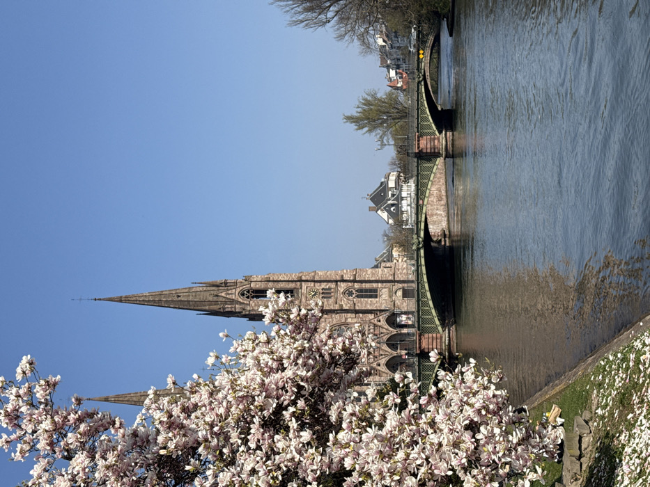 The image displays a clear spring day scene in Strasbourg, France, specifically featuring the Église Saint-Paul