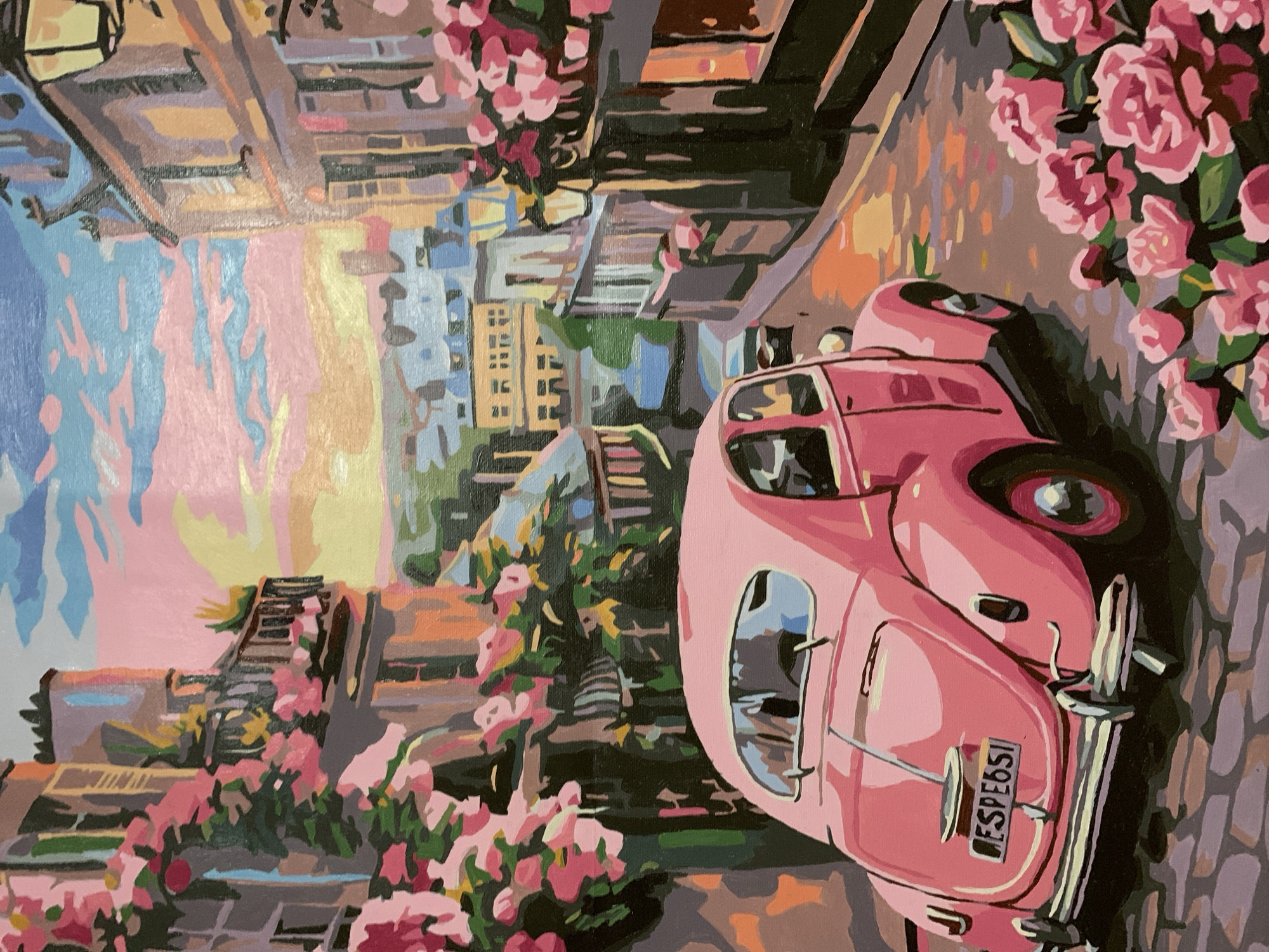 The image is a stylized painting depicting a narrow, winding cobblestone street characteristic of older European cities, situated in Sofia, Bulgaria. A vintage pink Volkswagen Beetle, observed from the rear-left quarter, is positioned on the uphill-sloping street. Its rear license plate displays "DESPE65I". Multi-story buildings with classic European architecture line both sides of the street, featuring balconies and windows. These structures are extensively adorned with abundant pink flowers, resembling roses or bougainvillea, cascading from balconies and walls. The sky above is rendered in a dramatic sunset or sunrise palette of pink, orange, and light blue, indicating twilight conditions. Distant city buildings are visible between the structures, receding into the background under the colorful sky. Street lamps are visible on the right side, and the cobblestone street reflects the warm hues of the ambient light. No individuals are depicted within the scene.