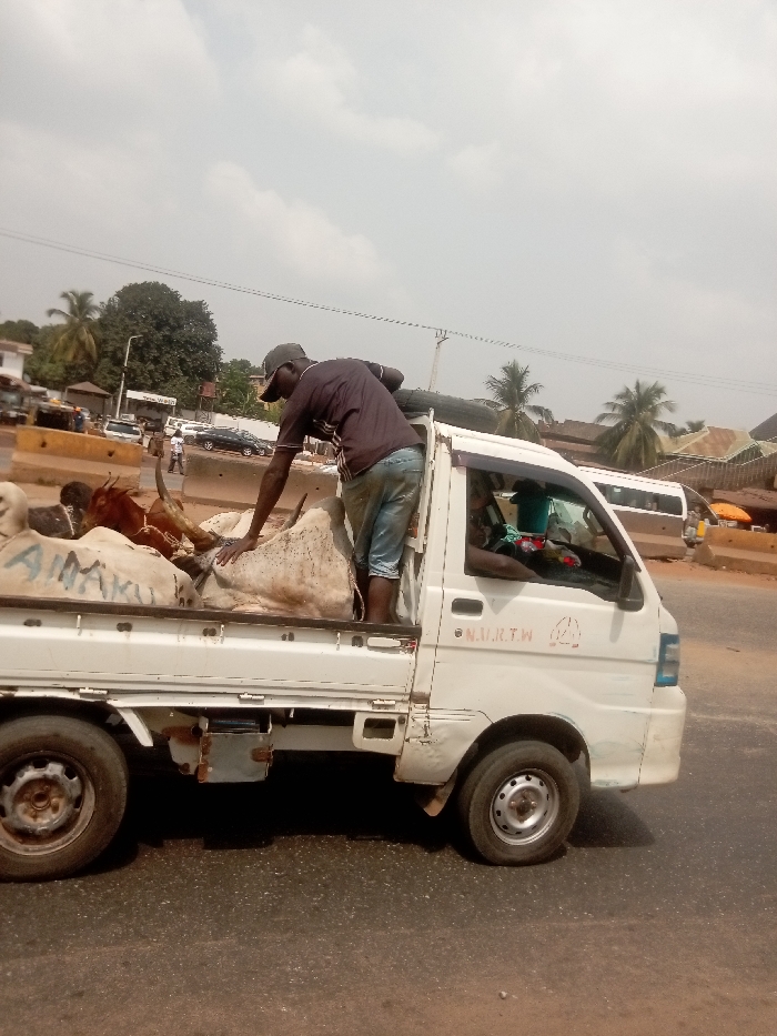 A white compact pickup truck, bearing "N.U.R.T.W" lettering on its driver-side door, is depicted in motion on a paved road under an overcast sky in Ogbunike, Nigeria. The truck's open bed contains at least three live cattle; one light-colored animal with prominent horns has the word "AIMAKU" stenciled in black on its left flank, while other cattle are partially visible. A male individual, wearing a dark shirt, light-colored shorts, and a dark baseball cap, stands upright in the truck bed, his right hand resting on the back of the prominent light-colored cow. Another male, dressed in a green garment, is observed in the driver's seat. The surrounding environment consists of a semi-urban landscape with various buildings, green foliage including palm trees, yellow concrete road barriers, and other vehicles positioned on what appears to be a multi-lane thoroughfare.
