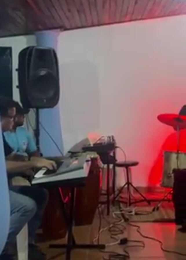 Inside a room with a wooden ceiling and tiled floors, two musicians are playing instruments. On the left, a man in jeans and a blue shirt sits at a keyboard, playing with both hands. To the right, a drummer wearing a black shirt and jeans plays a drum kit. The drum kit is bathed in a red light. In the background, there is a large speaker on a stand, conga drums, and various cables and equipment. The walls are white, and the room is lit with a mix of natural and artificial light. A seated person is visible in the foreground.