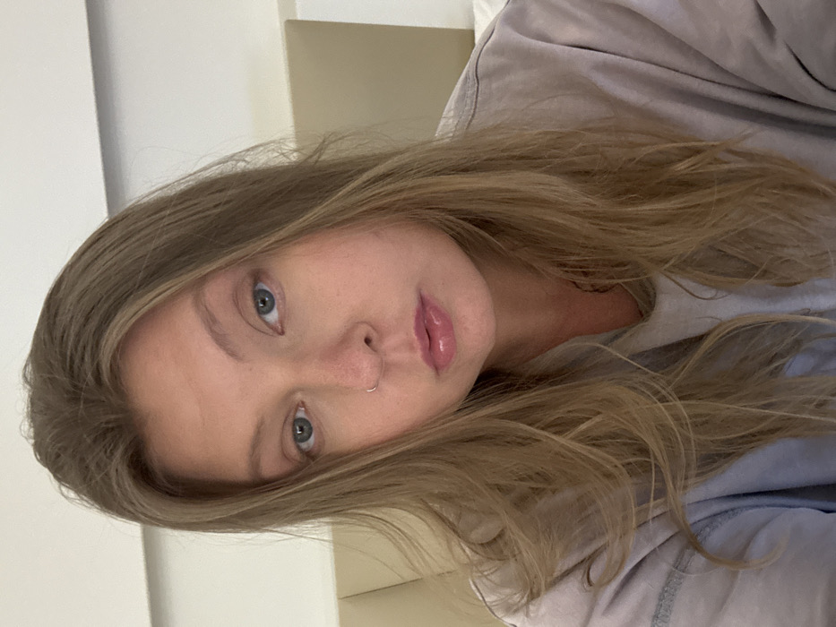 A blonde woman with light eyes looks into the camera. She has a small nose ring and shiny lips. She is wearing a grey shirt or sweatshirt. The background includes a white wall and part of what appears to be a bed or pillow. The image is rotated slightly to the right. Her hair is long and layered.