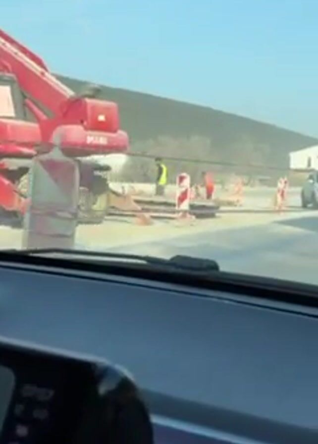 view from inside a car, driving through a road construction site. A red Manitou construction vehicle is visible to the left, along with construction workers wearing safety vests and red suits. Traffic cones and signs, including one with "BEMAX" written on it, are placed along the road. A white Nissan Qashqai with a license plate KO 88235 drives ahead. The environment includes a hillside, a few houses, and a clear blue sky. The road is under construction with exposed groundwork.