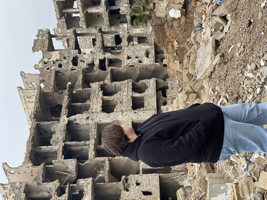 - "A single individual stands in the foreground, positioned to the left, facing right and slightly away from the camera, observing a severely damaged multi-story building in Joubar Municipality, Syria" by FM-NiDCC3, licensed under CC BY 4.0