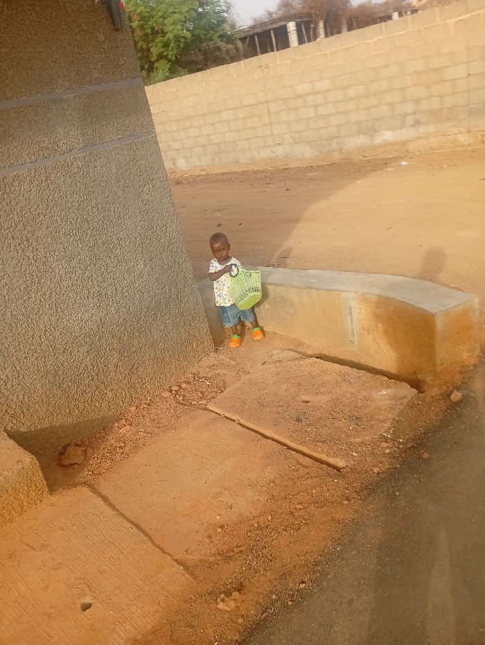 A young child stands outside a tan building and wall, holding a green plastic basket. The child is wearing a white patterned shirt, jean shorts, and orange sandals. A concrete ledge runs along the base of the wall. The ground is dusty and reddish-brown. Some concrete slabs form part of the walkway. Beyond the wall is a glimpse of another building and some sparse trees against a bright sky.