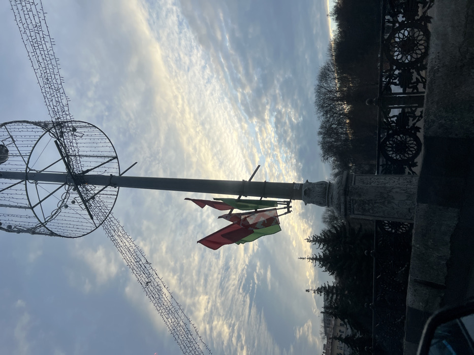The image captures a street view from inside a vehicle in Minsk, Belarus, looking towards a bridge over the Svislach River. The sky is overcast with scattered stratocumulus clouds, exhibiting a gradient from brighter whites and yellows on the horizon to darker blues higher up, indicative of late afternoon or early morning. In the mid-ground, a tall grey lamppost with an ornate, carved stone base stands prominently. Attached to the lamppost at mid-height are three Belarusian national flags, displaying red and green fields with a red ornamental pattern on the white hoist stripe, slightly unfurled by air movement. The upper section of the lamppost supports a large, circular metal framework adorned with numerous small white decorative lights. Several strings of similar lights extend horizontally from this framework across the upper left quadrant of the sky. The foreground includes a partial view of a vehicle's dark side mirror in the bottom left corner and a grey concrete barrier or curb stretching horizontally across the lower part of the frame. Immediately behind this barrier is a dark, elaborate cast-iron bridge railing featuring prominent circular decorative motifs. Beyond the railing, on the left, several dark green coniferous trees are visible, with indistinct light-colored buildings partially observable in the distance. To the right, a dense line of bare deciduous trees marks the far bank of the river, which is largely obscured by the trees and the bridge railing. The specific lamppost design, ornate bridge railing with circular motifs, and the presence of Belarusian flags are characteristic of the bridges along Prospekt Nezavisimosti (Independence Avenue) over the Svislach River in central Minsk, particularly in the vicinity of Gorky Park.