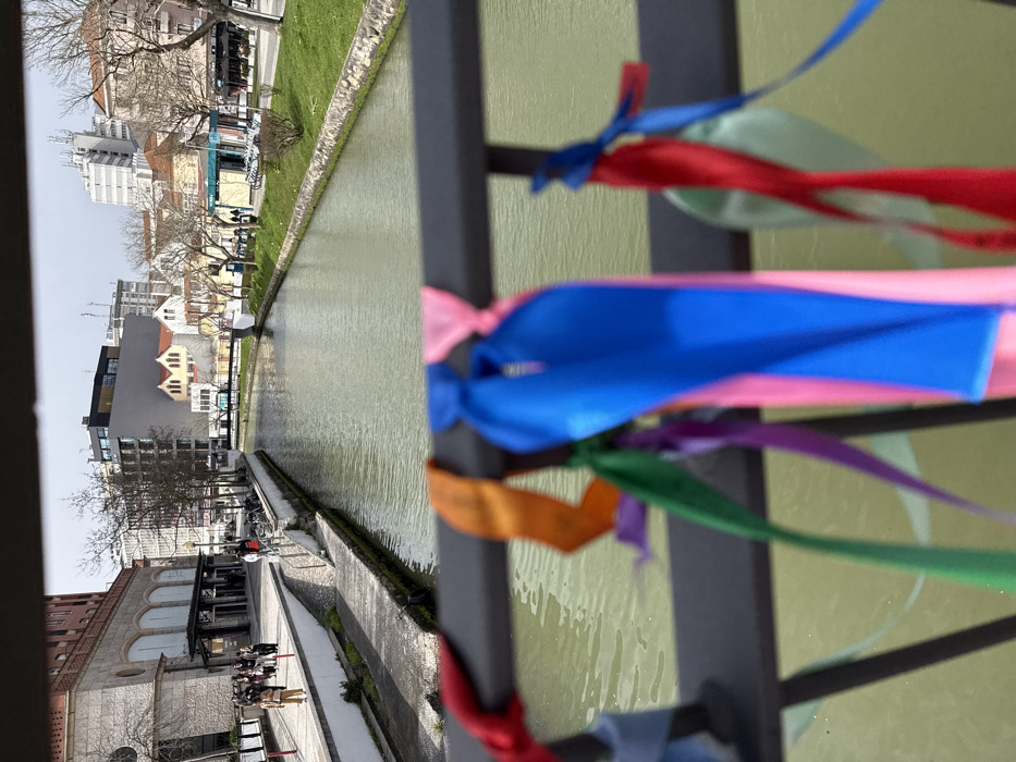 The image depicts a canal scene in the city of Aveiro, Portugal, viewed from a low vantage point on a bridge. In the immediate foreground, a dark grey metal bridge railing is prominently featured, adorned with multiple colorful fabric ribbons tied to its horizontal bars. These ribbons, in hues such as blue, pink, orange, green, purple, and red, are out of focus due to their proximity to the camera. Beyond the railing, a canal with greenish-brown water stretches into the background. The left bank of the canal features a wide, paved pedestrian walkway with a low white retaining wall. Numerous individuals are visible walking along this path. Further down the left bank stands a large brick building with arched windows and a dark grey canopy entrance. The right bank of the canal consists of a grassy strip bordered by a low wall, beyond which a paved path and additional urban structures are present. Several bicycles are parked along this section of the right bank. Buildings of various architectural styles, including traditional yellow and white structures and modern facades, line the canal on this side. Deciduous trees with bare branches are interspersed among the buildings. The background features a collection of multi-story urban buildings under a bright, possibly overcast, sky.