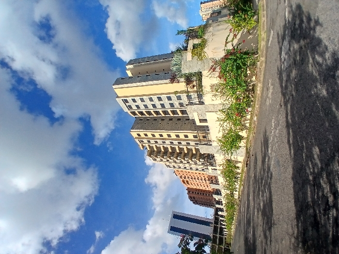 A slightly tilted perspective captures a blue sky filled with fluffy white clouds, juxtaposed against modern buildings. The buildings, varying in height and color from beige to peach, line a street. Lush greenery, including climbing plants with red flowers, adorns a wall separating the buildings from the road. The asphalt road features shadows cast by unseen objects.