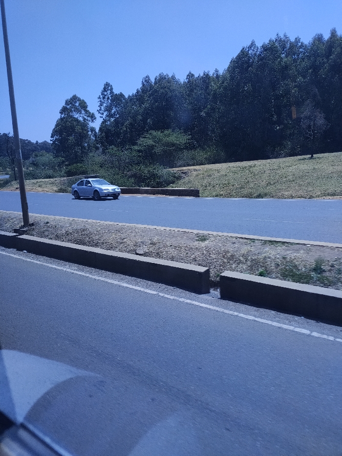 The image displays a daytime scene on a multi-lane asphalt highway in Nairobi, Kenya, beneath a clear blue sky. A light-colored four-door sedan is observed in motion on the road, traveling from right to left in the mid-ground. The immediate foreground shows a partial view of a vehicle's interior or exterior from which the photograph was captured, alongside a concrete barrier dividing road sections. Parallel concrete barriers form a median strip. To the right of the road, a grassy embankment ascends towards a dense line of dark green trees, which forms the background. A dark, vertical pole, likely a utility pole or street light standard, is visible on the far left side of the road. No individuals are discernible within the frame.
