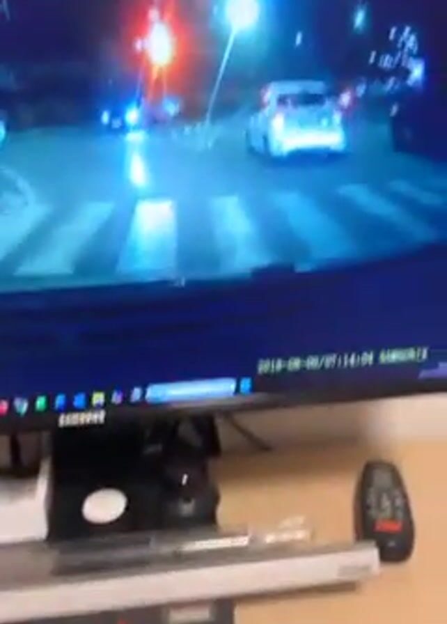 computer screen displaying footage from a dashcam. The dashcam footage shows a nighttime view from inside a vehicle approaching an intersection. There are several cars visible, some with their lights on, waiting at a crosswalk. A pedestrian wearing a helmet and an orange jacket steps into the crosswalk, appearing to gesture at the vehicle with their left hand. The footage is dated August 9, 2018, at 7:14:04 AM and has the "SAMSONIX" brand label on the bottom right.