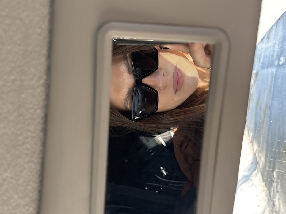 A forensic examination of the image reveals an individual, presumably female, reflected in a rectangular vanity mirror mounted within a light-colored overhead visor inside a vehicle