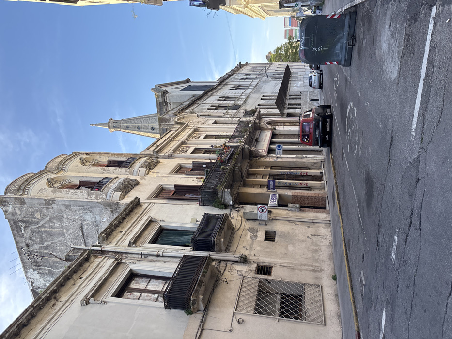 An old, tall building with a spire dominates the view, showcasing architectural details. Balconies with wrought iron railings adorn some windows. Signs are visible on the building facade, with "PENSION" clearly readable on two of them. A red car is parked alongside the building on a street that also contains a dark green dumpster. The sky is blue and partly visible above the building.