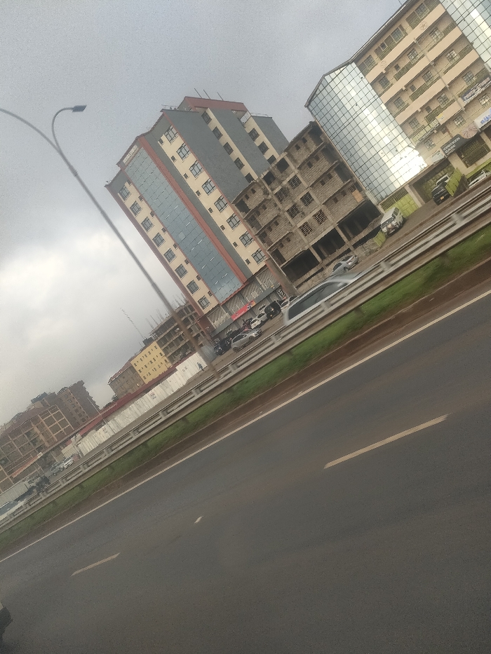 The image depicts an urban landscape in Biashara ward, Kenya, captured at an oblique angle under an overcast sky. In the foreground, a multi-lane asphalt highway is visible with white dashed lane markings. A green strip of grass separates the highway from a raised concrete barrier, behind which a service road or parking area is located. Multiple vehicles are present: several dark-colored cars (sedans, SUVs) are parked along the service road, and a light-colored van (possibly white or silver) appears blurred, indicating motion. One indistinct pedestrian figure is visible on a sidewalk near the parked vehicles. The background consists of several multi-story buildings. A prominent modern building with approximately 8-10 floors features a grey facade accented with vertical reflective glass panels and rectangular windows. Adjacent to it, a multi-story structure is under construction, characterized by exposed concrete blocks and visible scaffolding elements. To the right, another multi-story building with a cream-colored facade and numerous windows, some with small balconies, also incorporates reflective glass sections. Ground-floor businesses are visible on this building, including one sign partially legible as "CHEAPEST CAFE." Further down the road, more multi-story buildings, some appearing incomplete or under construction, are visible in the distance. A tall, curved street lamp post with a dark fixture extends from the lower-left into the upper-left of the frame.