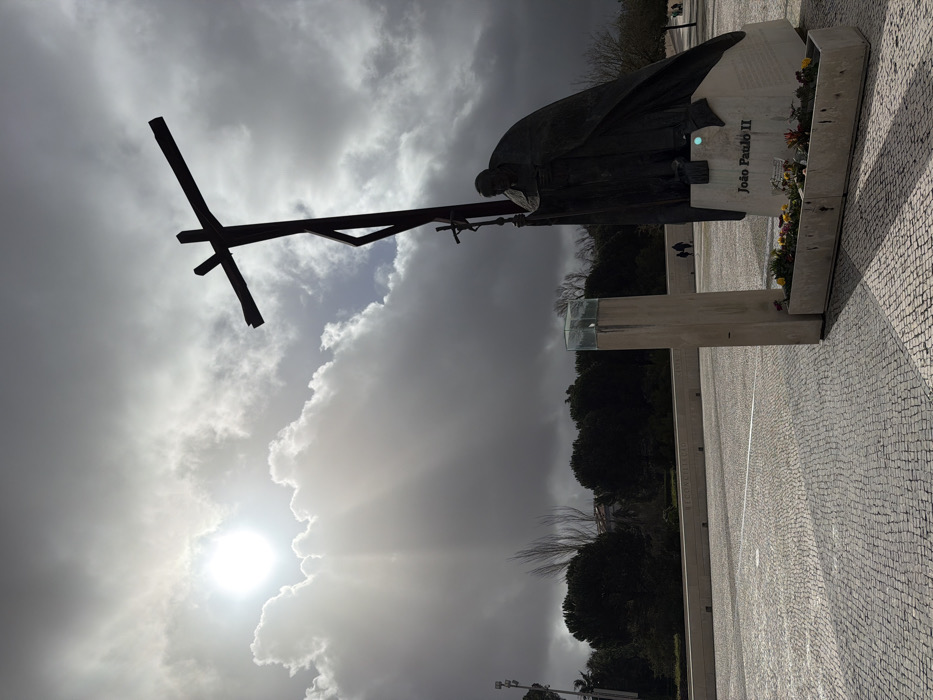 The image depicts the Sanctuary of Fátima in Fátima, Portugal. Central to the foreground is a dark bronze statue of Pope John Paul II, shown kneeling while holding a small crucifix. The inscription "João Paulo II" is visible on the statue's light-colored stone base. Behind and slightly to the left of the Pope's statue stands a taller, dark brown, stylized cross. Both monuments cast prominent shadows onto the expansive, light grey cobblestone plaza. To the left of the Pope's statue, a light concrete pillar with a translucent glass top is present. At the base of the pillar and extending towards the statue are planter boxes containing red, yellow, and purple flowers. In the mid-ground, a low, light-colored concrete wall spans horizontally, with two small, dark human figures walking along it in the distance. A dense line of dark green trees and some bare deciduous trees form the background. The sky is largely covered by substantial grey clouds; however, the sun, positioned in the upper left quadrant, emits intense white light and visible rays through a break in the clouds, creating strong illumination and contrast across the scene.