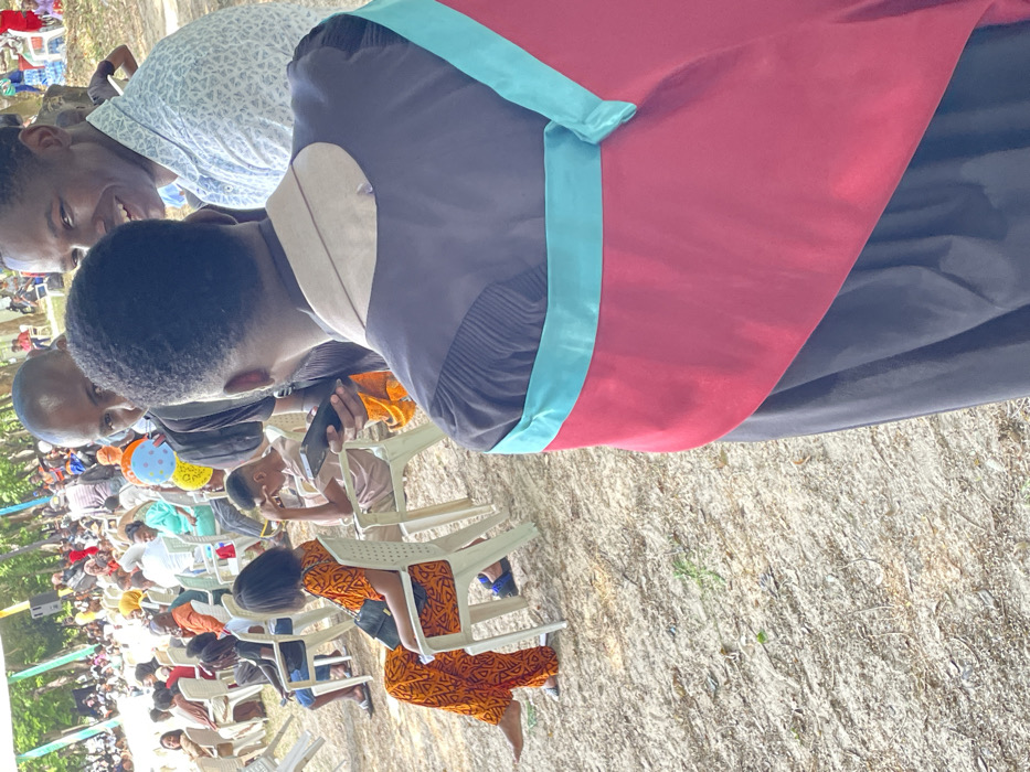 The scene depicts an outdoor gathering in Dar es-Salaam, Tanzania, under a large white tent structure. The foreground features the back of an individual in black academic regalia, including a gown, a light-colored collar, and a red and turquoise academic hood. This individual is positioned facing away from the camera, engaging with two men. The man immediately to the right of the person in regalia is wearing a black t-shirt and orange patterned trousers, holding a smartphone. He is looking towards the person in regalia with a slight smile. To his right, another man in a light blue patterned short-sleeved shirt is smiling and looking in the same direction. In the midground, to the left, a woman is seated in a white plastic chair, wearing an orange patterned jumpsuit and black sandals, her legs extended. Further back, another person sits in a white plastic chair, holding a smartphone, with their head lowered. The background reveals numerous attendees seated in multiple rows of white plastic chairs, positioned beneath the white tent. The ground consists of dry, light-colored soil or sand with minimal vegetation. Trees are visible in the far background.